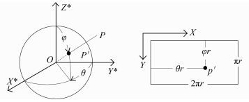 1.2 球面经纬度到全景相机坐标系全景相机坐标系即球心直角坐标系,经纬度(θ, φ)到(X*, Y*, Z*)的转换关系如图 1所示。将经纬度转换为与全景球共心的单位球的球面坐标(Xs, Ys, Zs)公式为: