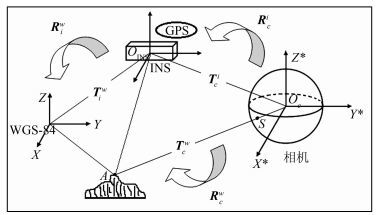 5) 利用全景相机与惯导之间的标定参数,可以将球心直角坐标系转换到惯导坐标系;利用GPS与惯性测量单元(inertial measurement unit,IMU)获得的全景外方位元素,可以将惯导坐标系转换到世界坐标系。