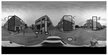 街景地图以球面全景序列的方式记录城市道路沿线的景观[1],除了具有漫游功能,还包含着丰富的商业、市政与交通等信息。将这些感兴趣的点(point of interest,POI)进行采集并用地理信息系统管理起来,可以产生巨大的经济效益与社会效益。