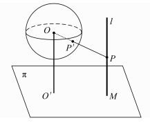 2.2 竖直线约束如图 5所示,竖直线l与地平面π有交点M,目标点P位于l上。利用光束OP′与直线l相交,便可以得到目标点P的地理坐标。