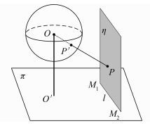 2.3 竖直面约束如图 6所示,竖直面η与地平面π有交线l,上面可以找到不重合的两点M1和M2。目标点P位于η上,利用光束OP′与竖直面η相交,便可以得到目标点P的地理坐标。