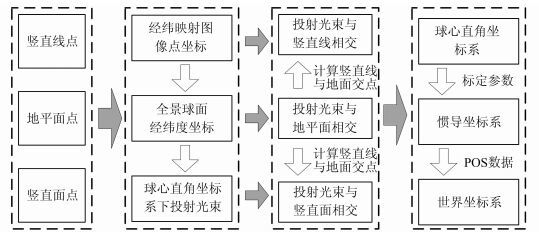 3 方法流程利用本文提出的基于几何约束与单幅全景影像的兴趣点快速定位方法,可以在三维渲染的全景球上量测,直接获得球面经纬度;也可以在经纬映射图上量测,获得平面像素坐标。从经纬映射图的像素坐标计算目标的世界坐标的具体流程图如图 7所示。