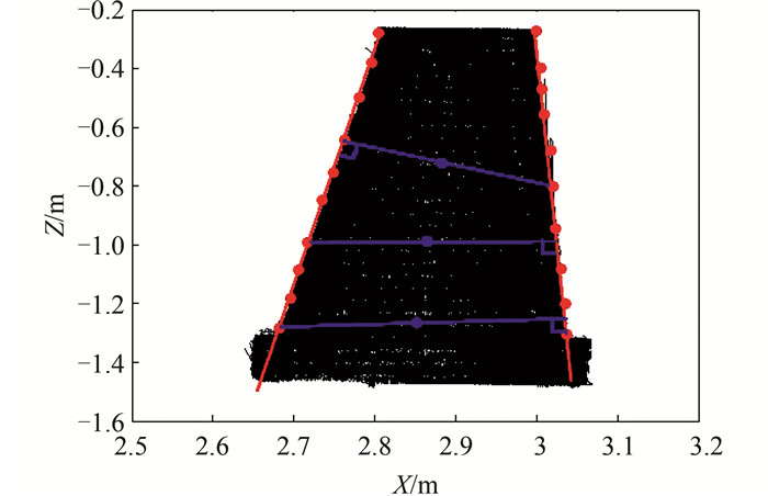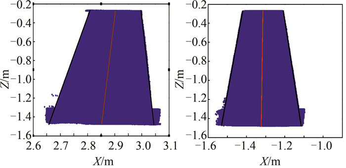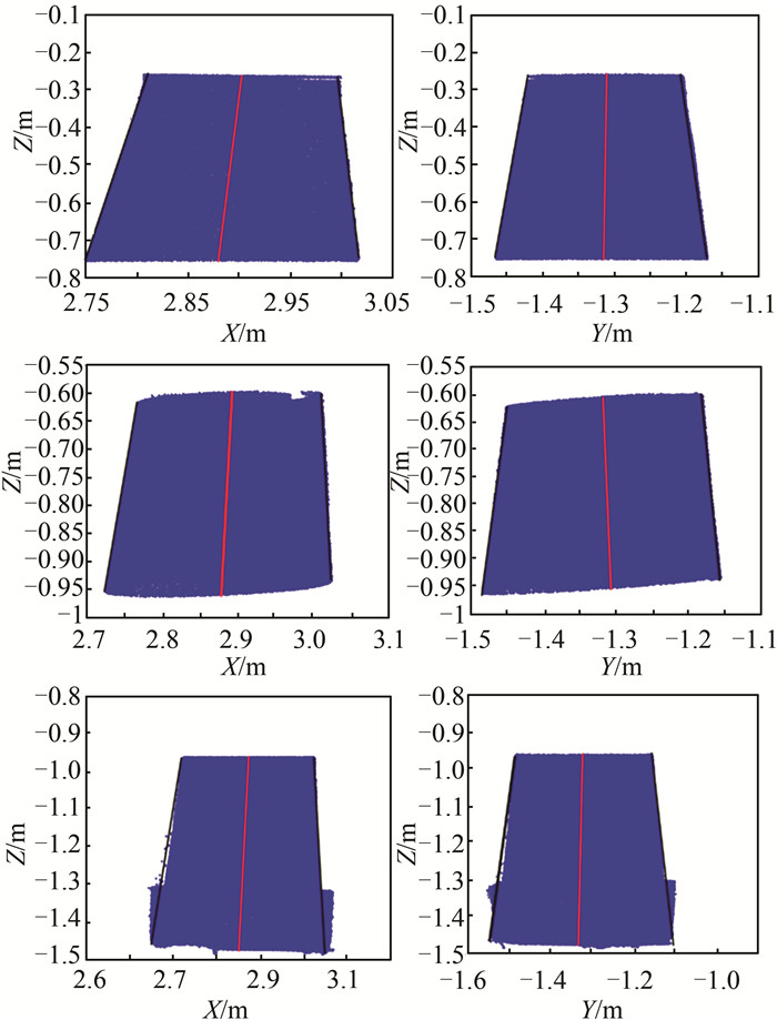 中轴线提取采用RANSAC算法进行,获得观测墩在XOY和YOZ两个面上的中轴线投影,进而得到中轴线方程[9]。首先对全部点云进行中轴线拟合,拟合结果如图 4所示。为了检验RANSAC算法拟合轴线的内符合精度,本文将点云沿Z轴方向等厚度分为3个部分(每部分约为0.4 m),分别进行拟合,结果如图 5所示。