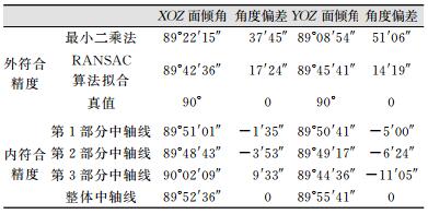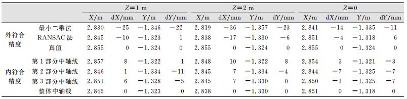 2.3.2 内符合精度分析本文以整体拟合的中轴线方程为标准,比较3个不同部分拟合的中轴线方程,从而分析RANSAC算法进行中轴线拟合的内符合精度。从表 1中轴线角度误差大小分析可知, 相对于整体拟合的中轴线,3个部分的拟合结果XOZ面上投影偏差最大为9′33″;在YOZ面上投影偏差最大为11′05″。从表 2中轴线平移误差大小分析可知, 相对于整体拟合的中轴线,3个部分拟合结果在X方向上最大误差为10 mm,在Y方向上最大误差为11 mm。总体来说,RANSAC算法拟合结果有较好的内符合精度。