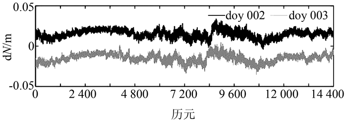 从图 1中可以看出,两天里该测站的坐标残差时间序列表现出极强的相关性,并且年积日003天的序列相对于002天有一定的负时延。由于在短时间内,测站的位置并未发生实质性的移动,那么坐标时间序列表现出的波动性主要为多路径效应以及高频的随机噪声。如果测站在监测过程中受到瞬时外部环境的激励影响产生瞬时移动,那么通过这种重复性去除多路径效应,能够很好地提取出形变信号。