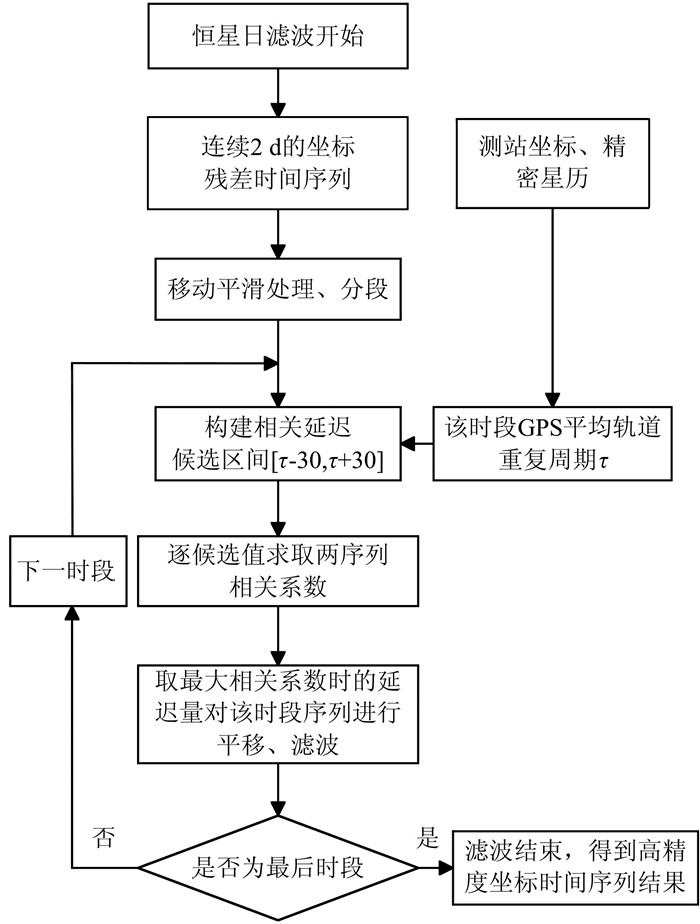 | 图 2 顾及分段相关性的恒星日滤波算法流程 Figure 2 Process of Improved Sidereal Filtering Accounting for Segments' Correlation |