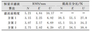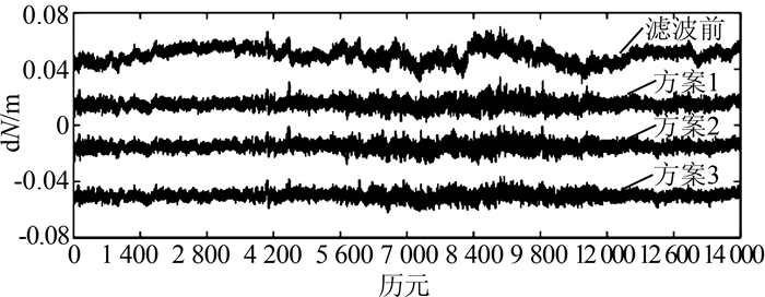 表 2为3种滤波处理后的坐标残差时间序列的精度统计。从表 2可以看出,3种滤波方案在一定程度上均很好地改善了坐标残差时间序列的精度。方案3由于从坐标残差时间序列本身出发,分段求取的最优相关延迟,从而更为精细地对残差序列进行滤波,取得了更优的滤波效果。在N、E、U 3个方向上,滤波后的精度,方案3较方案1、方案2分别提高了7.7%和6.1%、5.0%和3.2%、11.2%和4.8%。