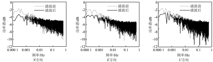 为了进一步得出优化后的恒星日滤波在不同频率域上的滤波效果,本文对N、E、U 3个方向上的滤波结果进行了谱分析,如图 4所示。