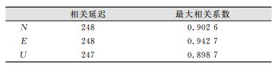 利用上述移动平均方法对图 1两序列进行平滑,然后将年积日002天N、E、U 3个方向以236为中心左右两边各取30个历元作为负延迟进行平移,并采用相关系数法求两序列相关系数,获取最大相关系数时的相关延迟。