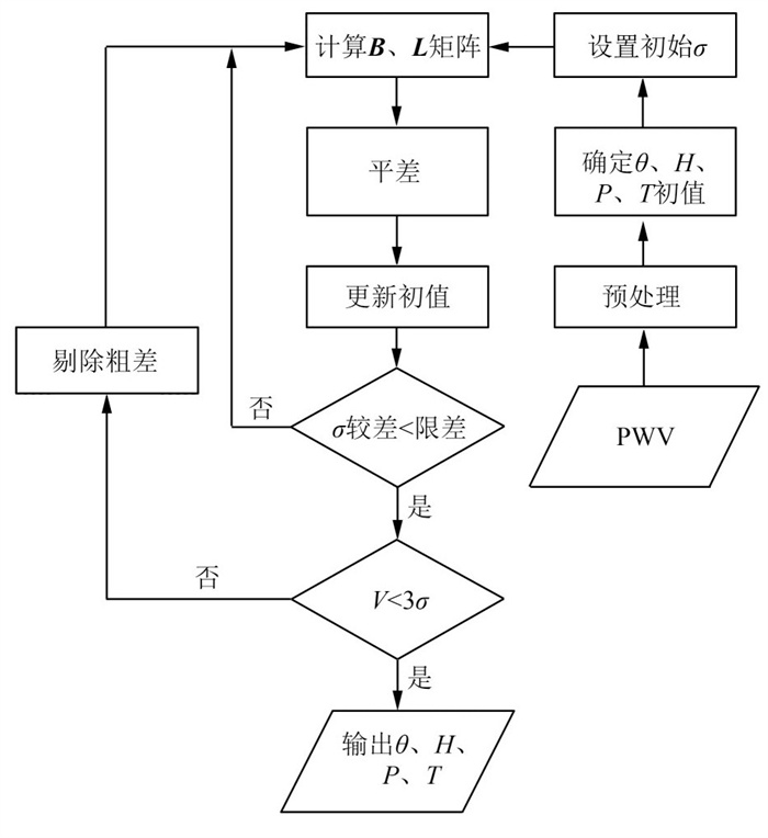 将上述预处理后的Radio/PWV取前半部分进行最小二乘解算,解算时将Radio/PWV作为观测值,将经GAMIT解算得到的ZTD作为无误差的真值,以前后两次中误差σ的差值是否小于限差为一重迭代条件,为进一步剔除预处理遗漏的粗差,设置3σ作为筛选数据的二重迭代条件,ZTD直接转换PWV的流程图见图 3。将GAMIT解算得到的ZTD及探空测站计算得到的PWV代入式(10),可得到BJFS站ZTD转换为PWV的模型: