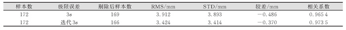 极限误差通常用来做剔除粗差的阈值,其值一般为3倍的中误差σ,本文将GPS/PWV与Radio/PWV较差的标准差(standard deviation, STD)作为中误差,以3σ为检核的极限误差,数据预处理结果见表 1。