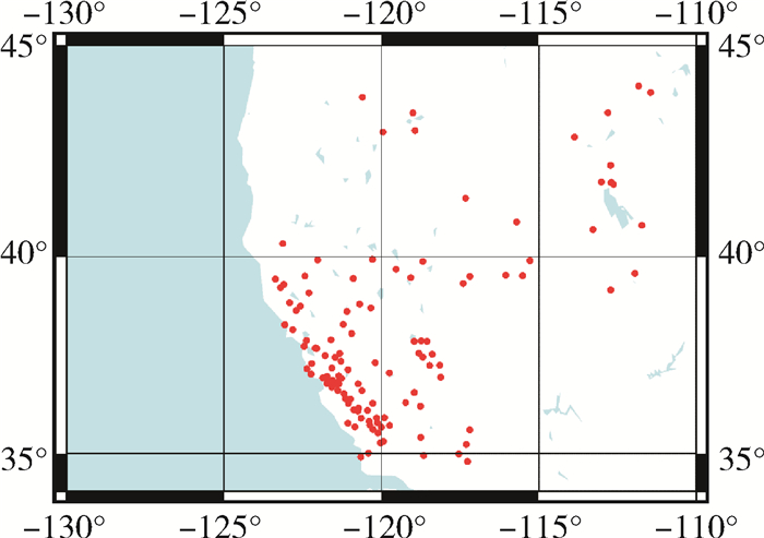2 GNSS坐标序列处理本文的测站坐标残差时间序列由SOPAC提供,所有序列的时间跨度长,数据有效率高。测站的位置分布如图 1所示。