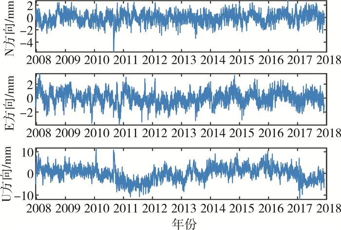 GNSS坐标残差序列可通过对原始坐标序列采用式(1)的模型来剔除其中的截距、趋势项和季节性信号得到。