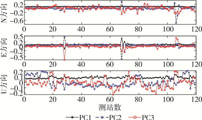 通过PCA法计算北美西部区域119个测站的N、E、U方向前3个主成分分量的空间响应,如图 3所示。其得到的N、E、U方向第一主成分贡献率依次为37.46%、39.20%、54.10%,第二主成分贡献率分别为23.07%、20.91%、4.32%,第三主成分贡献率分别为4.91%、6.97%、2.63%。前三个主成分分量的累计贡献率依次为65.44%、67.09%、61.05%,前3个分量综合包含了原坐标序列中的大部分有效信息。因此,本文PCA中选取前3个分量来剔除CME。
