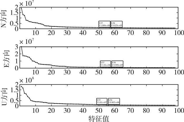 Chen等[21]提出2 a或3 a的窗口长度适用于绝大多数GPS坐标序列,本文选取3 a通过MSSA来提取CME。MSSA的前p个模式分量选取异于PCA,本文提出以特征值的指数幂下降两级为准则,选取了前59个模式分量进行重构提取CME。图 4表示了MSSA的第3~100个特征值大小。