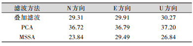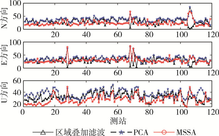由图 5可知,大部分测站的PCA效果要优于区域叠加滤波和MSSA;但对于某些异常站点,MSSA效果要优于PCA和区域叠加滤波。分析表 2可知,PCA在N、E、U 3个方向的整体滤波效果均要优于区域叠加滤波和MSSA;同时,MSSA在N、U方向上的滤波效果均劣于区域叠加滤波和PCA,E方向与区域叠加滤波相当。