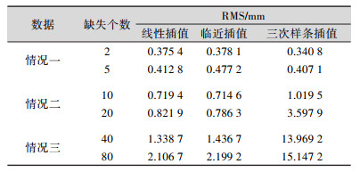 本文根据实验数据的连续空缺历元数的主要分布情况,例举了3种典型的数据缺失情况。3种情况下不同方法的插值结果与真值间差值的RMS如表 1所示,因篇幅有限,未给出插值前后的坐标序列。