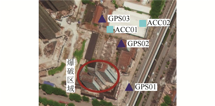 通常使用记录速度和加速度的地震仪、强震仪监测爆破,测量精度高、监测效果好,但使用的设备或软件价格昂贵、操作复杂。同时,由于地震仪和强震仪受到振幅限制,当监测点速度或者加速度超出量程范围时,不能准确记录监测点的运动。GPS空间定位技术具有全天候、连续、自动、高精度和不受振幅限制等特点,广泛应用于大地测量、城市控制网等。随着高频GPS(1~100 Hz)接收机的出现及高频数据处理算法的成熟,GPS不仅可以监测长周期、低频的地表运动[1],还可以在监测短周期、高频动态变化领域发挥重要作用[2-7]。高频GPS能够有效监测瞬时的地面震动,同时GPS测量仪器操作简便、有利于提高工作人员的监测效率。