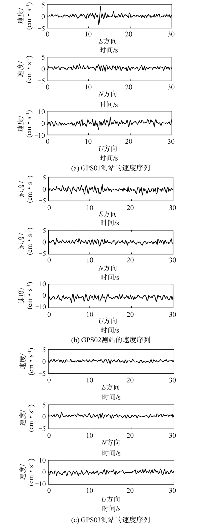 | 图 4 GPS01、GPS02和GPS03测站的速度序列 (起始时间为北京时间23时32分30秒) Fig.4 Velocity of GPS01, GPS02 AND GPS03 (from 23:32:30, Beijing Local Time) |