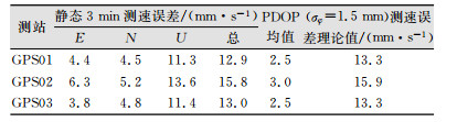 采用上述单点测速算法,计算3个测站的速度,为保证GPS测速精度,处理间隔设为5 Hz。选取爆破前3 min的静态数据,对测速误差进行统计,统计结果如表 1所示。取σφ为1.5 mm,笔者得到测速误差的理论值,从表 1可以看出,测速误差的统计值与理论值符合得很好。静态5 Hz GPS测速精度的统计表明,GPS测速水平精度可达mm/s,高程精度可达1 cm/s。