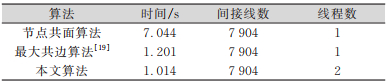 2 算法实现与比较算法程序通过地理信息系统开发平台KingMap V6.0实现,KingMap V6.0平台升级版基于QT5.9开发,通过C/C++语言实现,采用Qt Concurrent框架的blockingMappedReduced机制实现MapReduce功能,多次采用阻塞机制是因为前后步骤之间需要同步,保持数据一致性。该平台运行环境为VMware虚拟机:Windows7 SP1旗舰版64位操作系统;DDR3 800 MHz 4 GB内存;Intel(R)Core(TM)i5-4200U @ 1.60 GHz 2.30 GHz双核处理器;硬盘50 GB,5 400 r/min。算法程序以某镇的行政区图层(64个要素)、宗地图层(290个要素)和地类图斑图层(1 730个要素)为例进行间接线的构建和导出,检验结果表明,导出的结果数据真实可靠。不同算法的性能比较结果如表 1所示。