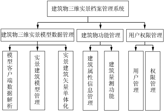 2 建筑物三维实景档案管理系统1) 系统的功能模型。系统功能模型如图 3所示, 主要包括建筑物三维实景模型数据管理、建筑物功能管理和用户权限管理3部分。