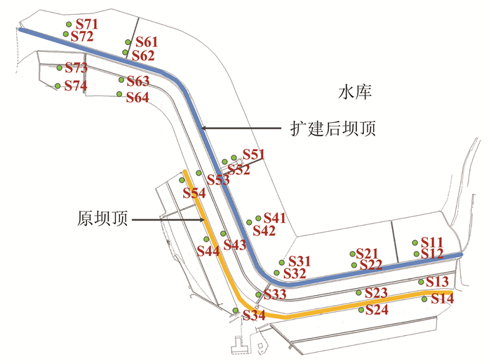 长岭陂水库主坝体结构如图 1所示,原坝顶的高度为56.4 m,扩建后坝顶的高度为66.7 m,原坝顶和扩建后坝顶的空间位置如图 1中橙色和浅蓝色实线所示。扩建完成后,水库主坝体进行了水准监测,共计布设水准点28个,分4个纵断面和7个横断面布设,监测点空间分布情况见图 1。所收集水准监测数据的时间段为2011年8月至2012年5月,期间共进行了4期沉降监测。