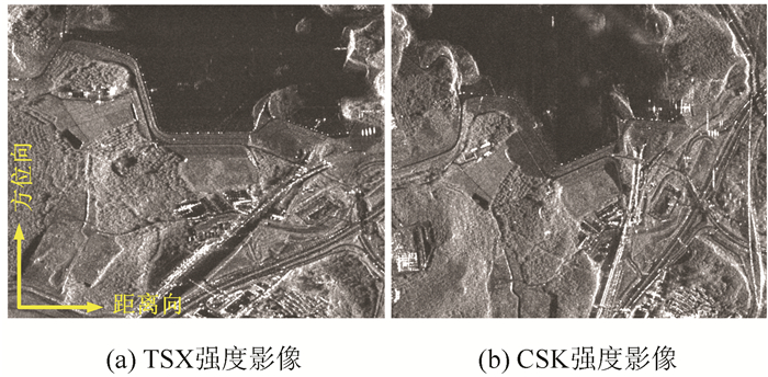 图 2为水库主坝体平均强度影像。图 2(a)为基于升轨TSX卫星影像; 图 2(b)为降轨CSK卫星影像。水库坝体迎水面为水泥面板,后向散射信号较弱;背水面为草皮,后向散射信号相对较强。由于坡面倾角小于22°,而雷达卫星的本地入射角最大为37°,因此未产生阴影。但是由于卫星轨道与坝体走向的关系,面向SAR卫星的坡面存在透视收缩,使得坡面在雷达视线方向缩短。