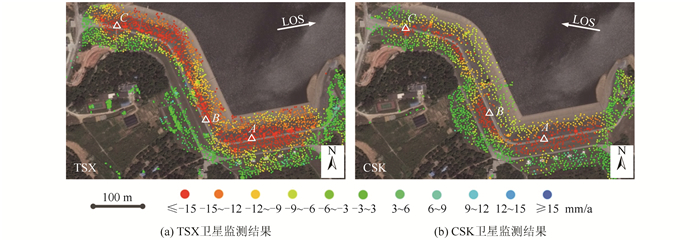 3 InSAR监测结果分析 3.1 InSAR监测结果本文采用MT-InSAR技术对土石坝表面变形进行分析,选取时间相关系数大于0.7的像素点为相干监测点,最终获取的长岭陂水库土石坝表面监测点在雷达卫星视线方向(line of sight,LoS)的线性变形速率如图 4所示。本文方法可在水库土石坝表面获取较多的可信监测点,其中TSX影像提取PS点773个,DS点3 553个;CSK影像提取PS点349个,DS点2 143个。