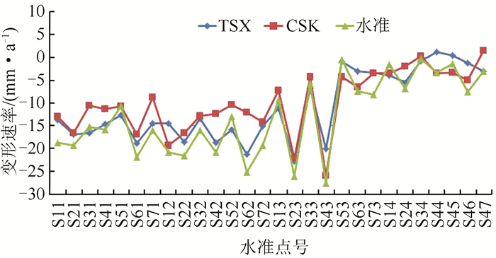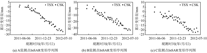 监测点A、B、C(图 5)在2011年5月至2012年6月期间内的变形情况如图 5所示。3个监测点在观测期间均出现了明显的变形,且基本为线性变形。TSX和CSK影像在点A、B、C的累计变形量分别为-26.4 mm、-21.3 mm;-32.8 mm、-25.7 mm;-20.9 mm、-18.4 mm。