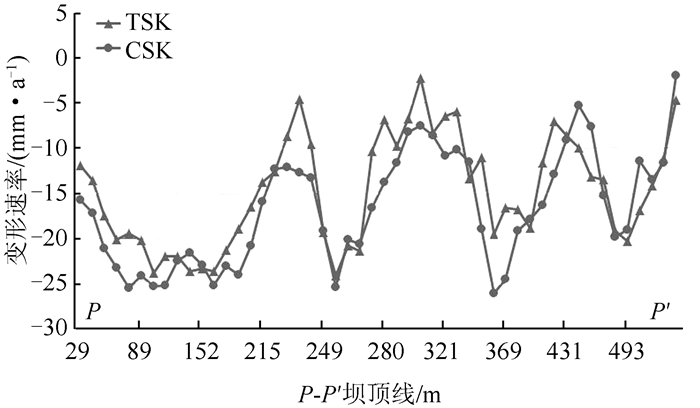 沿坝顶线P-P′每隔10 m选取1个目标点,并基于目标点选取周边临近的InSAR监测点进行均值运算,所获取的坝顶沿线变形速率剖面线如图 6所示。分析TSX(三角形)和CSK(圆形)监测结果可知,两者在观测期间内的变形速率基本一致,差值为2.1 mm/a,标准差为3.3 mm/a。同时,两者均发现沿坝轴线坝体存在较大的不均匀沉降,可能与坝体回填土深度相关。