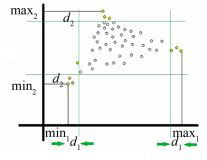 1.3 候选像元的迭代N-FINDR算法为解决候选像元数量大的问题,结合端元坐标的高光谱影像端元提取方法的思想[10],本文提出了候选像元的迭代N-FINDR算法(CIN-FINDR)。CIN-FINDR算法的基本思想是:在进行IN-FINDR算法运算前,对候选像元进行预选择,将明显是混合像元的数据在样本中进行剔除,从而减少候选像元的样本数,然后再从预选择后的像元中进行IN-FINDR算法运算。其具体算法是在迭代N-FINDR算法的第1) 步前增加如下步骤:选取候选像元:根据凸面几何性质,端元总是落在每一维的最小最大位置(如图 2所示)。基于这个原理,同时考虑噪声的影响,在经过预处理的高光谱数据中寻找出第i维数据中的最大值maxi和最小值mini。提取边缘距离di=k×(maxi-mini),k为常数,本实验中k取0.1。那么候选像元区域为(mini, mini+di)和(maxi-di, maxi),i=1, 2, …, p。其余步骤同迭代N-FINDR算法。