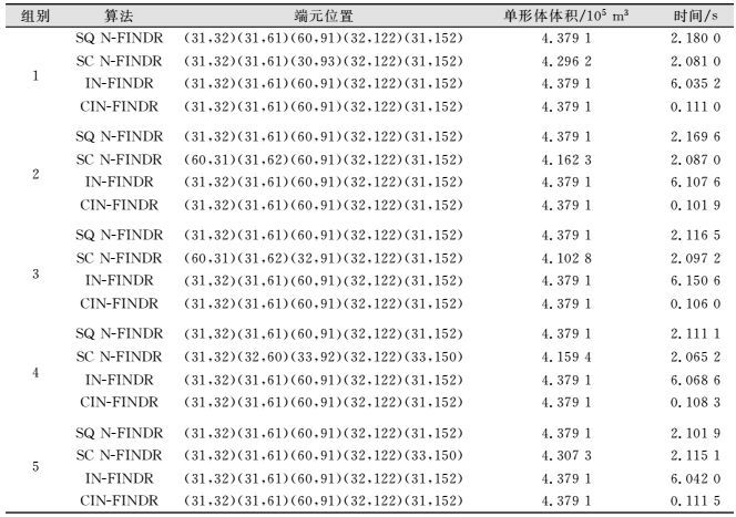 从单形体体积分析,在实际的高光谱数据中采用IN-FINDR算法和CIN-FINDR算法的稳定性好,能够较好地搜寻出端元,但同时由于实际地物中很难确定端元个数,因此算法会出现误差,导致搜寻的端元不准确。从运行时间分析,CIN-FINDR算法搜寻出端元的时间更短,约为SQ N-FINDR算法(或SC N-FINDR算法)的1/7, IN-FINDR算法的1/25。