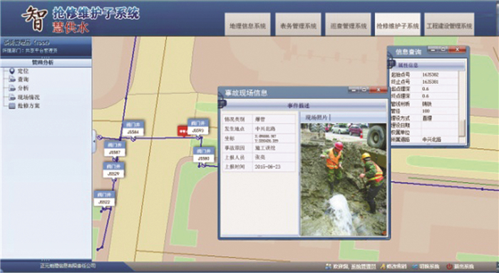 1.2 地理信息支撑地理信息技术的引入改变了原来供水行业的管理思路,管理者进入系统就能够在地图上看到所有与供水相关的信息(水源地、供水设备、加压泵站、输送管道、水厂等),并且通过地图的方式进行管理,同时实时监控数据也方便快捷地展示在地图上。通过系统的相关统计分析功能可为相关工作提供辅助决策支持,并能够结合工作进行调度指挥和档案管理。