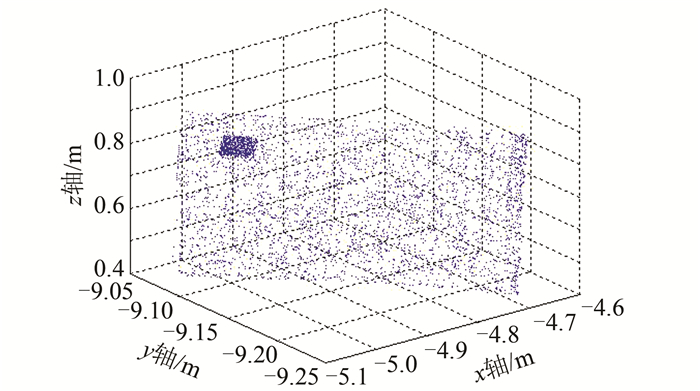 1.1 特征面拟合特征平面拟合采用基于随机样本采样一致性算法。首先,在点云中随机选取3个点拟合成一个平面,设置点到面的距离和法向量偏差的阈值;然后,计算点云数据中剩余点到该平面的距离以及法向量的偏差,统计距离值和法向量偏差小于该平面阈值的点云数量[7];最后,根据每个面满足条件的点云数量选择一个最优平面,即为点云数目拟合最大的平面。步骤如下:①在输入点云P中随机选取3个点,构造平面Si;②计算平面Si法向量ni与{p1, p2, p3}3个点的法向量夹角,如果存在夹角过大则舍弃平面Si,回到步骤①,否则继续;③计算其余点pi到平面Si的距离di和{p1, p2, p3}法向量夹角n′i,统计满足小于距离阈值和法向量偏差阈值的点的数量,记为Ni;④重复步骤①~③,选取Ni值最大的对应平面Si作为拟合成的平面,输出平面参数。