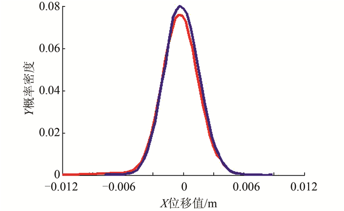 最后,对变形量进行提取,分别提取出未贴片前的点云数据和贴片后的点云数据,并用概率密度函数进行处理,结果见表 1,对概率密度函数图用直方图形式进行绘制,如图 3所示,其中蓝色曲线表示未贴片点云,红色曲线表示的是贴片点云。