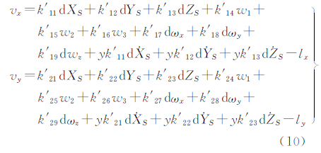 式中,k′1i、k′2i(i=1,2,…,9)为新的误差方程系数,可由式(7)、式(9)很容易求得,该表达式中同样也完全没有三角函数运算,lx、ly与式(7)相同。误差方程式(10)写成矩阵形式为