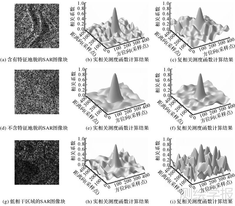 下面利用实测数据来验证实、复相关函数的上述特点。从SIR-C/X-SAR系统获取的实测数据中截取了3块数据(64像素×64像素),分别对应于含有特征地貌区域、不含特征地貌区域以及低相干区域,如图 1(a)、(d)和(g)所示。图 1(b)~(c)给出了含有特征地貌的SAR图像对的滑动实、复相关测度函数计算结果,图 1(e)~(f)给出了不含特征地貌、散射特性较为一致的SAR图像对的滑动实、复相关测度函数计算结果,图 1(h)~(i)给出了低相干区域SAR图像对的滑动实、复相关测度函数计算结果。