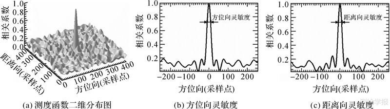 因此,设计一种准则,使得在这种准则下算法能自适应地选取合适的相关函数,是配准算法设计的关键。为此,提出了配准灵敏度准则,配准灵敏度包括方位向灵敏度和距离向灵敏度,是指配准测度函数归一化后在其峰值位置沿方位向和距离向剖面的3dB宽度[19],类似于SAR图像分辨率的定义。图 2给出配准灵敏度示意图,图 2(a)是归一化后测度函数,图 2(b)、(c)分别给出了在其峰值位置沿方位向和距离向的剖面图,对应的3dB宽度(半功率点处的宽度),即为配准测度函数的方位向灵敏度和距离向灵敏度。