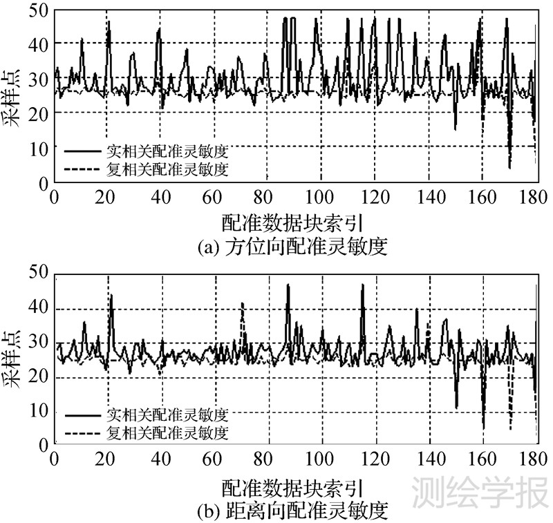 由此可知,配准灵敏度越小表明该配准测度函数的配准精度越高。因此,在实际SAR图像对配准过程中,可以依据配准灵敏度来选取相应的(实、复)相关函数作为配准测度函数。