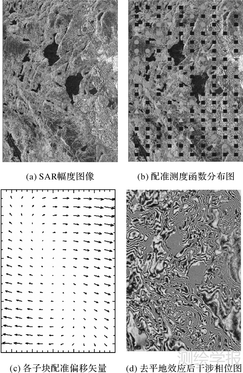 计算出各数据块的实、复相关配准灵敏度后,利用第3节的方法即可确定各块的实、复相关配准测度函数分布,结果如图 4(b)所示。在总共180个子块中,方位向、距离向均采用复相关作为配准测度函数的有111块,方位向、距离向均采用实相关作为配准测度函数的有29块,方位向、距离向分别采用实、复相关函数作为配准测度函数的有6块,方位向、距离向分别采用复、实相关函数作为配准测度函数的有20块,依据粗差剔除准则①、②剔除了14个子块的配准偏移量(方位向距离向配准灵敏度门限值均取46),通过局部曲面拟合的方式得到剔除位置的偏移量,结果如图 4(c)所示。对图 4(c)所示的配准偏移量进行双线性插值可以得到所有像素处精确偏移量,然后对SAR辅图像进行重采样处理。图 4(d)显示的是配准完成后去平地效应后的干涉相位图。