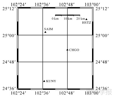 3 算例分析为检验本文算法的有效性,对华南某参考站网的实测数据进行了处理。各参考站均装备了双频LEICA GRX1200PRO类型的接收机以及LEIAT504型号的抑径天线,其地理分布、4字符测站名以及所选取的独立基线如图 1所示。观测值的采样率为1 s,起始观测时刻为2006-03-01-00-00(UTC),截止高度角选为15°,总观测时长为4 h。