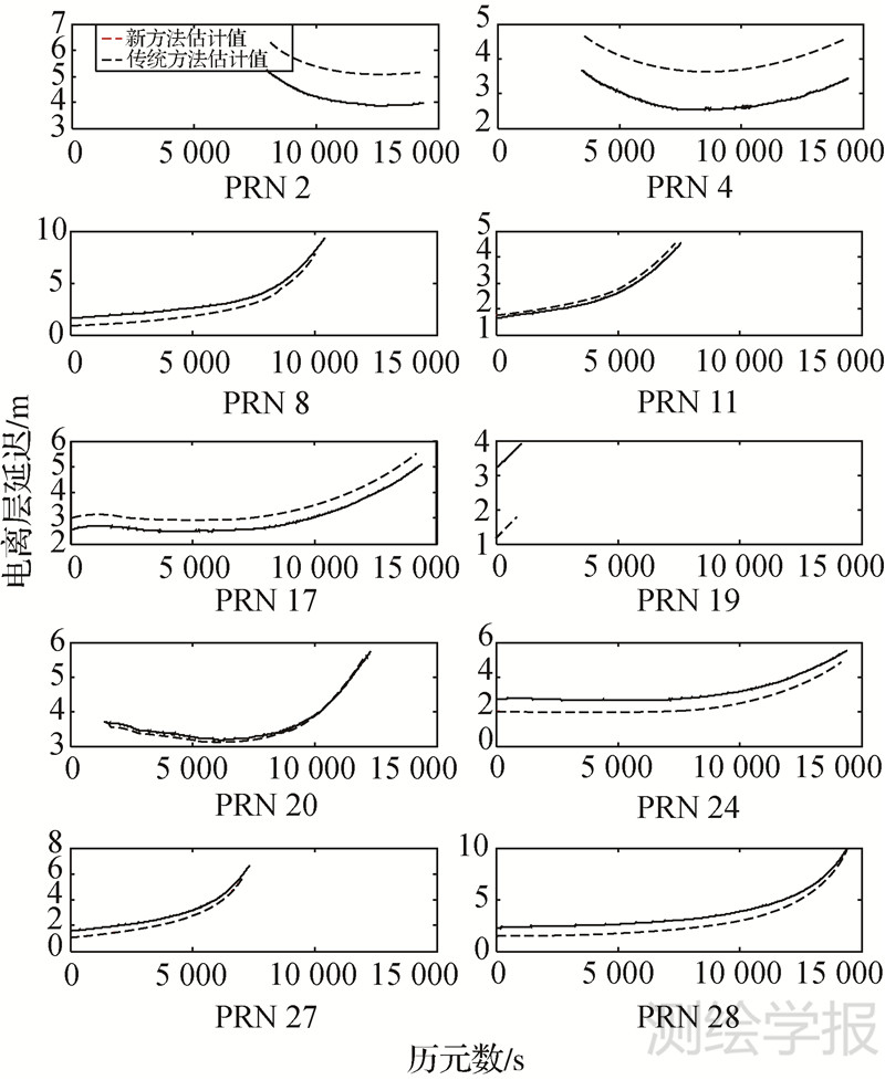除本方法的计算结果外,图 2中亦给出了对流层延迟的先验模型值,该模型值与本方法计算值的差异即由ZTWD引起;需要指出,部分卫星的计算结果存在跳变,原因在于按批次估计ZTWD的过程中,相邻批次间的参数尚未施加合理的有效约束。图 3中除本文方法计算的电离层延迟外,亦给出了利用文献[7]方法提取得到的对应结果,其中,对于部分卫星,两种方法的结果差异甚至可达到米级,该差异主要源于标准方法中的提取误差影响,尤其针对卫星跟踪早期,由于低高度角观测值中的强多路径效应,上述结果差异较之跟踪后期更为显著,如PRN 2、28等。