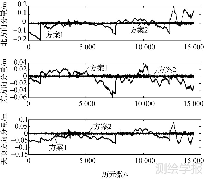 方案 2 基于2.2节中描述的状态方程,对新方法提取的大气延迟进行一步时间预报(预报时长为1 s),采用预报值改正对应时刻的双差观测值,进而求解基线分量的单历元固定解。