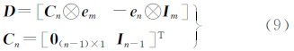 Inm分别为对流层天顶湿延迟 / (zenith tropospheric wet delays,ZTWD) x1 =[ g1T … gnT]T、钟差参数x2=[αjT β jT ]T以及电离层延迟x3=[ (ι11,…,ι1m)…(ιn1,…,ιnm) ]T的设计矩阵。e和I分别表示所有元素均为1的列向量和单位矩阵,下标表示维数;