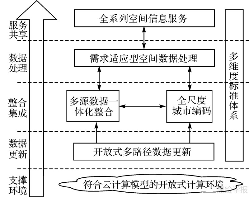 2 关键技术如图 1所示,开放式空间基础信息平台的关键技术覆盖数字城市中空间数据支撑、更新、处理、共享和应用的所有关键环节,形成完整技术、服务和标准体系。