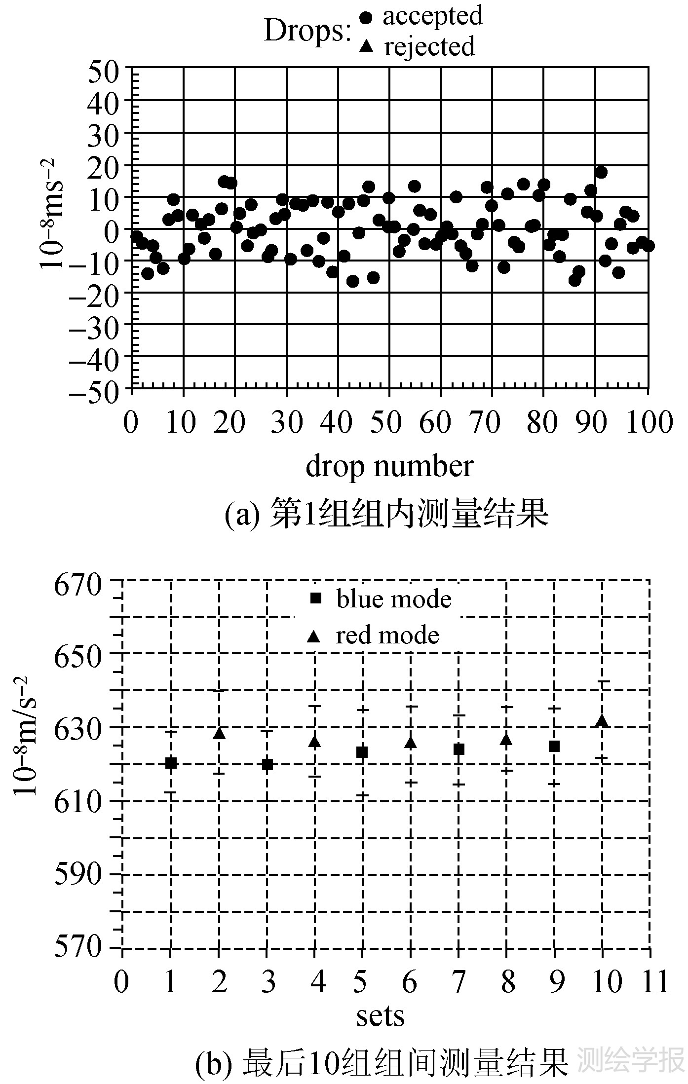 4 测量结果与分析根据庐山相对重力仪格值标定场上基点分布及其环境特点,观测点的选择主要依据观测台的稳定性,考虑交通是否便利,且尽可能选择原有的观测点,以便与以前的观测值进行比较。根据以上原则,初步选择的观测点为3#、8#、11#、12#、17#、18#和22#,同时,为了保证观测效果,在上述7个观测点之中使用下落间隔时间为6 s,组数为10组的参数设置进行了第1次观测(表 5带*观测点)。随后,选择了第1次观测中的4个观测点进行第2次观测,观测时间均小于第1次测量,以验证A10-022绝对重力仪的稳定性。由最后结果(表 4)可以看出,两次的绝对重力观测的标准差均小于4.0×10-8 m/s2(最大3.58×10-8 m/s2),而且两次观测结果的互差也在6×10-8 m/s2以内(最大5.52×10-8 m/s2)。由于此次测量大多选择在夜间进行,环境噪声较小,单组的测量标准差均低于50×10-8 m/s2。图 1为观测质量较好的3#观测点第1组组内和最后组间结果,其中第1组内标准差为8.11×10-8 m/s2,最后的组间标准差为2.25×10-8 m/s2,红蓝激光模式测量组间的结果的分离由激光频率的漂移造成。