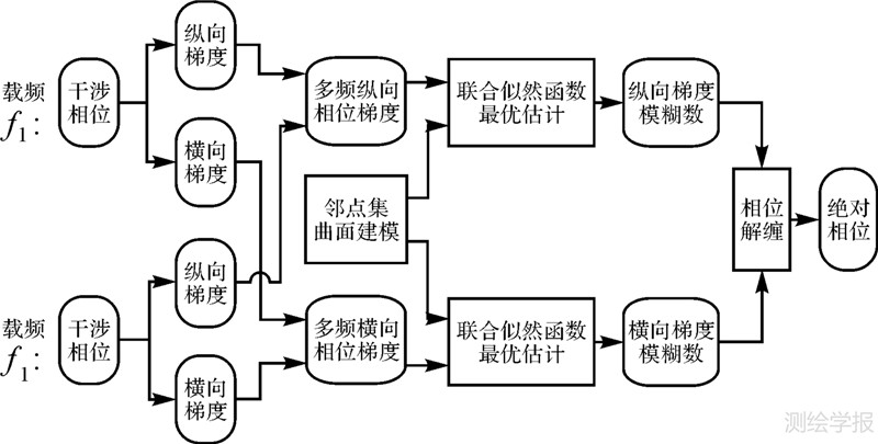 在多频InSAR信号处理研究方面,大体有3类方法。第1类方法是对多频干涉相位进行融合处理,其中,文献[7]提出基于多频相干性分析和卡尔曼滤波的解缠相位融合和DEM生成方法;文献[8]提出的多频最小二乘相位解缠是对传统单频最小二乘解缠算法的推广; 而文献[9]则提出了利用相关信号子空间方法(coherent signal subspace method,CSSM)进行多频干涉相位融合的技术,这类方法能够降低相位解缠误差,但是难以解决干涉相位的频谱混叠问题。第2类方法是基于观测相位的算术性质进行解模糊处理,其中,文献[10]最早提出应用中国余数定理、投影方法和线性组合的方法来解算干涉相位的整数模糊周期的思想;文献[11]也设计了一种基于中国余数定理的多波段 InSAR 相位解缠方法,这类方法能够较好地解决干涉相位频谱混叠问题,但处理结果易受噪声影响。第3类是基于统计学的方法,文献[12]首先提出了一种基于最大似然准则的多频相位估计方法;文献[13]也提出了一种利用多通道干涉数据,不经过相位解缠直接进行地理编码和高程反演的最大似然估计方法;文献[14]则在其研究中将传统相位解缠的初步结果应用于多频干涉最大似然估计来重构DEM,这些方法因严格依赖于局部像素的多频观测相位而对噪声的适应性较差。文献[15—16]提出的基于马尔科夫随机场模型的多频干涉最大后验概率估计方法,虽然利用相位观测矩阵的结构特性提高了对噪声的适应性,但是算法运算量成倍增加。