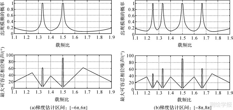 为分析该方法对相对相位误差的敏感性,下面以双频InSAR系统为基础研究其参数选择问题。相对相位误差不仅会导致梯度估计错误,还可能使估计区间内出现两个或多个似然函数值十分接近的估计量。对不同的载频比及梯度估计区间,通过加入不同程度的噪声,分别统计系统能够容忍的最大噪声标准差以及出现模糊估计的概率,所得结果如图 2。