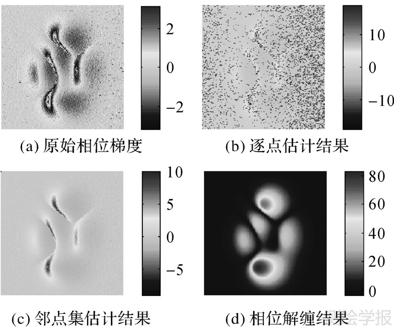 以X波段载频为参考,分别采用逐点估计法和基于邻点集的估计方法,对该双频干涉相位进行联合处理。以横向(距离向)相位梯度为例,图 4(a)显示了原始相位梯度的欠采样现象,图 4(b)为对这组数据的逐点最大似然估计结果,可见相位梯度基本得到正确重建,但是受相位噪声影响而产生了诸多病态估计点,而采用基于邻点集的梯度估计方法所得结果如图 4(c)所示,其中病态估计量大大减少,表明该方法增强了对相位噪声的适应性。此时,将重建的相位梯度用于支持相位解缠,得到如图 4(d)所示的正确相位解缠结果。